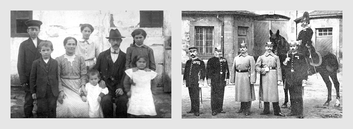 Auf dem Bild oben links sieht man die Eltern und Geschwister von meiner Großmutter (Katharina) und rechts die Landgendarmerie. Es ist das einzige Foto, auf dem die gesamte Familie abgebildet ist. Man muss nicht studiert haben, um sehen zu können, dass der Status ein ganz anderer ist als bei den Nixdorfs aus jener Zeit. Sie waren nämlich arm! Nicht gewollt, sondern weil politische Verhältnisse dazu führten. Im I. Kapitel findet man eine Verlinkung zu den Wanderarbeitern in Ost und West. Die aufgerufenen Seiten beschreiben die Situation sehr gut.