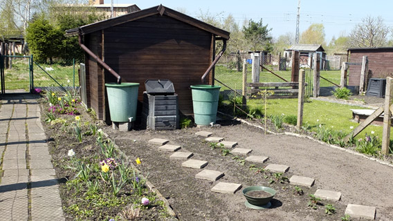 Provisorisches Anlegen von Wegen und Beeten, Aufstellen von Regentonnen und Kompostanlage