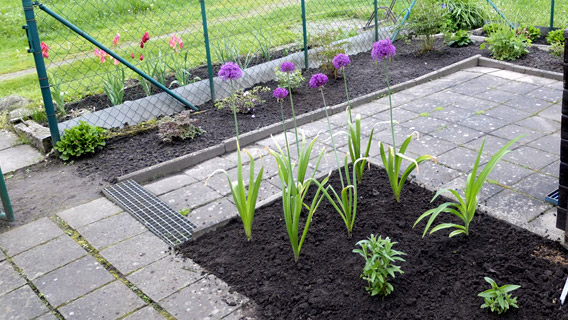 Neben dem Hochbeet wurden Staudengewächse angepflanzt und umrahmt