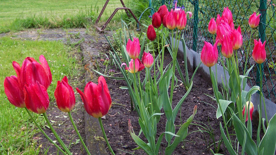 Vor dem Gartenzaun blühen farbenfroh die Tulpen